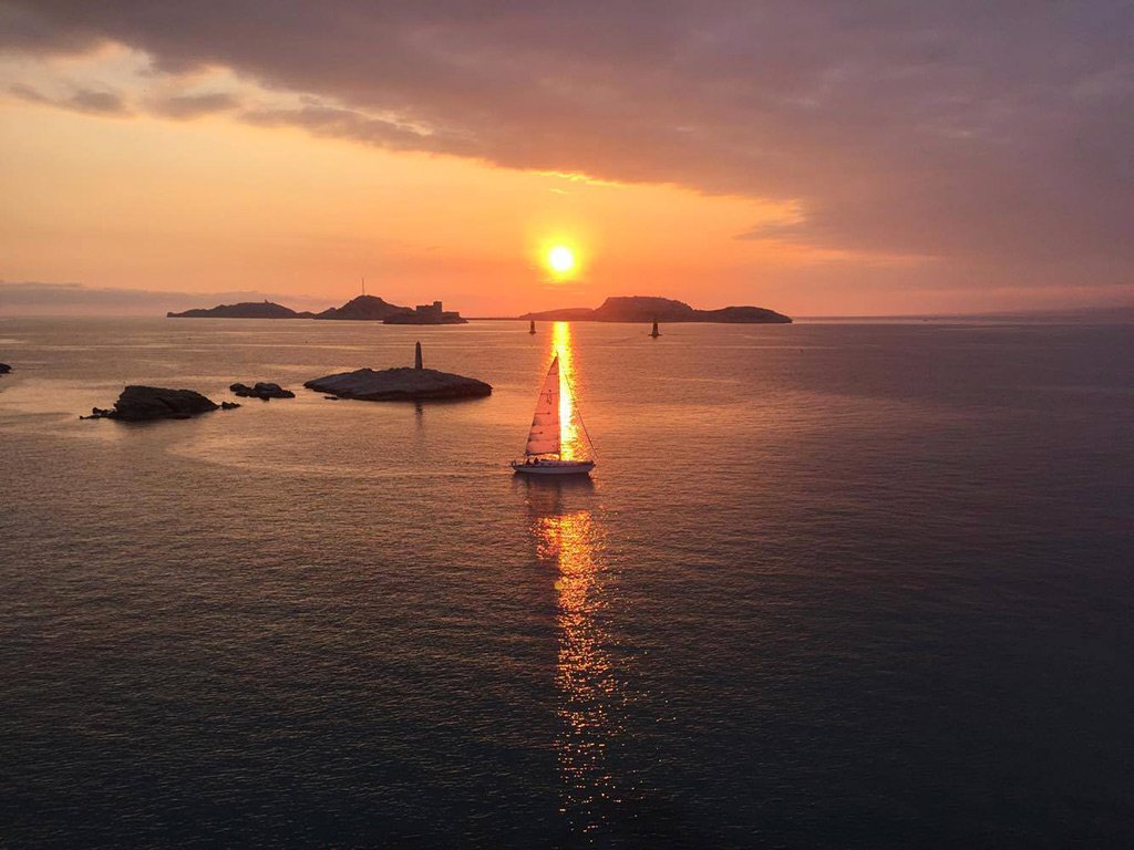 Apéritif à bord avec vue sur le soleil se couchant derrière Marseille